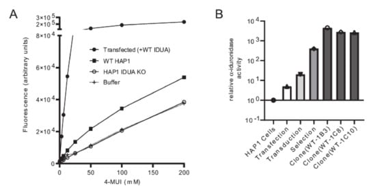 The following are available online at https://www.mdpi.com/2409-515X/6/4/88/s1, Supplementary Figure S1: Standard curve for α-iduronidase activity in WT clone 1B3, Figure S2: Activity of α-iduronidase was determined in several clones using a higher lysate concentration for more accurate stratification of residual activity.