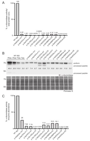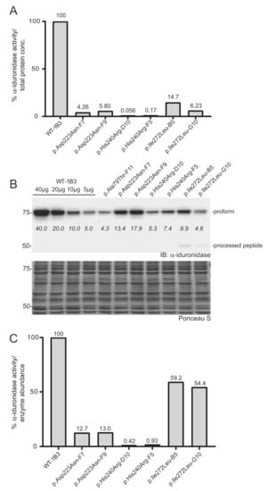 The same lysates used for the α-iduronidase activity assay (typically at 2.0 mg/mL) were resolved by SDS-PAGE and transferred to nitrocellulose membranes. Immunoblotting was done with anti-α-iduronidase antibody (1:500, overnight) followed by incubation with anti-rabbit HRP-conjugated secondary antibody (1:2000, 1 h). The ChemiDoc™ imaging System (BioRad, Hercules, CA, USA) was used to obtain Western blots and to analyze the relative amount of α-iduronidase expressed in each transduce cell clones. In order to more accurately obtain the relative α-iduronidase abundance in each of the clones tested, we loaded a range of different protein amounts (40, 20, 10, and 5 µg) from one of our WT clones (WT-1B3). The same amount of total lysate protein was resolved in each lane of this standard range by adding the necessary amount of IDUA KO lysate to reach 40 µg. Normalization of this relative enzyme activity with the amount of α-iduronidase signal measured by densitometry of Western blots allowed the determination of relative specific activity for each variant-bearing form of α-iduronidase. For loading control, Ponceau S staining on the nitrocellulose membrane was performed.