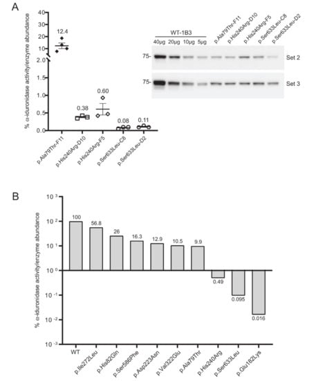 Three additional IDUA variants (p.Asp223Asn, p.His240Arg, p.Ile272Leu) were investigated to determine their relative specific activity (Figure 4). For comparison, we included WT-1B3 and A79T-F11 in this second set. In case of A79T-F11, specific activity was measured as ~18% vs. the previous run (~8%) with higher fluorescence of the lysate as well. These deviations in the specific α-iduronidase activity could be partially due to 1) variation in the quantification of α-iduronidase by Western blot, or 2) different culture conditions at the time of harvest that could result in altered processing status of α-iduronidase. Nevertheless, WT-1B3 showed similar fluorescence as before, and specific activities of mutant IDUAs were analyzed again as relative values compared to the WT-1B3. p.Asp223Asn variant IDUA showed ~13% activity, p.Ile272Leu showed 54–59% activity. The p.His240Arg variant showed a much lower activity (0.4 ~ 0.9% relative to WT-1B3), however, this was ~10 times higher than p.Ser633Leu (0.05 ~ 0.09% activity). As these two variants were previously reported to exhibit similar residual activity [15], we performed our analysis on two more biological replicates of the p.His240Arg and p.Ser633Leu cell clones. The average specific activity from the triplicate analysis of these two variants, and all the other relative specific activities, are shown in Figure 5. Based on this chart, one can interpret variants with relative specific activity that is above the line as pseudodeficient and those below the line as pathogenic, although we acknowledge that the number of variants studied will need to increase before reliable boundaries can be established.