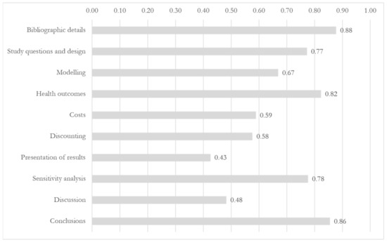 The results of the assessment based on the guideline are presented in Figure 1. “Bibliographic details”, “Conclusions”, and “Health Outcomes” were the most represented items, with overall scores of 0.88, 0.86, and 0.82, respectively. The lowest overall scores were associated to the categories “Discounting” (0.58), “Discussion” (0.48), and “Presentation of results” (0.43). This was mainly due to low scores reported within the categories, respectively, the items “Justification of discount rates”, “Generalizability and transferability of the economic results”, and “Present values and trends of costs and the population and payer level”. The overall characteristics of the EEs are available in Appendix D.