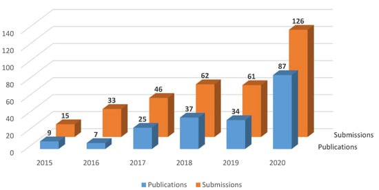Number of submissions and publications (non-peer review article types such as editorials, corrections, obituaries, comments, replies, and meeting reports are excluded from the published papers) in 2015–2020.