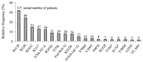 Frequency of PAH variants in 370 patients with elevated Phe levels detected by mass screening. Percentage of patients with mutations in PAH was detected by direct sequencing or multiplex ligation-dependent probe amplification (MLPA) in all the participants enrolled in this study. Numbers at the top of the vertical bars represent the actual number of patients with each mutation. Infrequent mutations have been omitted. Phe; phenylalanine, PAH; gene encoding phenylalanine hydroxylase, * stop codon.