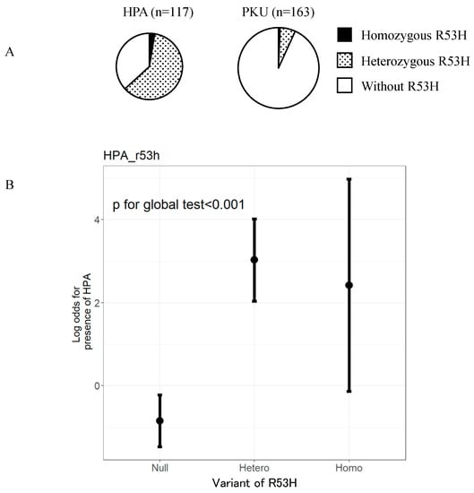 According to the integrative Japanese Genome Variation Database (iJGVD, https://ijgvd.megabank.tohoku.ac.jp, accessed on 18 February 2021), the allele frequency of p.R53H in the general Japanese population was reported to be as high as 5% []. Several studies have reported that p.R53H is associated with HPA phenotype [,,,,].On the contrary, a few reports exist that correlates PKU with p.R53H [,].