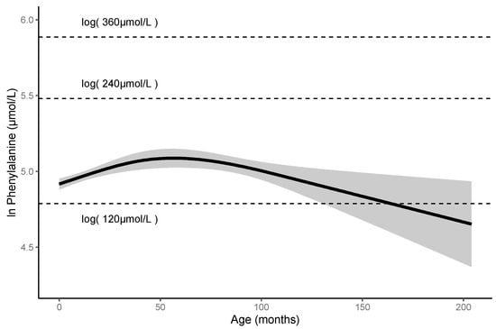 Since there are no guidelines for HPA in Japan, patients with this condition are also monitored according to the guidelines for PKU. The European guidelines for PKU recommend frequent measurements of blood Phe levels; weekly up to the age of 12 months, followed by fortnightly till 12 years, and monthly for >12 years []. The current Japanese follow-up guidelines of PKU recommend that patients undergo measurement of blood Phe levels every four weeks until elementary school entrance []. We found that the predicted Phe levels in patients with HPA carrying p.R53H never exceeded 360 μmol/L without Phe-restricted diet until 200 month of age (Figure 2). These facts suggest that patients with HPA do not require frequent follow-ups. Further, we recommend that guidelines be developed on a priority basis for patients with HPA. In patients with PKU, first trimester of pregnancy should be monitored since the Phe levels tend to elevate during this period []. According to the European and US guidelines, when the untreated blood Phe level of women of childbearing-age with PKU is 120–360 μmol/L, treatment is unnecessary [,]. Extrapolating our study findings, we expect the blood Phe levels of pregnant women with HPA carrying p.R53H to not exceed 360 μmol/L during pregnancy. Further, our findings suggest that Phe-restricted diet and frequent follow-ups are not necessary for such patients even during pregnancy.
