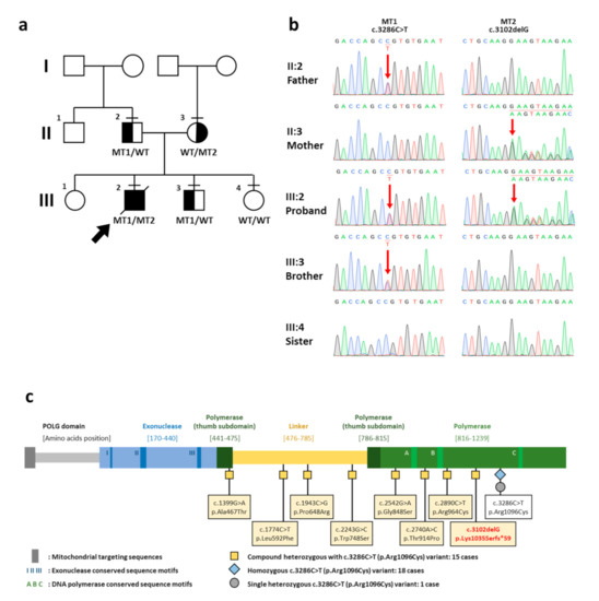 Family pedigree, chromatograms, and schematic diagram of the POLG protein. (a) Family pedigree. The proband is indicated by an arrow. A horizontal line above each symbol indicates the family members participated in genetic testing. (b) Chromatograms show that the proband possesses the compound heterozygous variants, c.3286C>T and c.3102delG, in POLG (NM_002693.3). The heterozygous variant, c3286C>T, is observed in the father and the proband’s younger brother. The heterozygous variant, c.3102delG, in POLG is present in the mother. Red arrows indicate the POLG variants. The younger sister possesses two normal alleles. (c) Schematic diagram of the POLG protein. The POLG variants reported to be compound heterozygous with the c.3286C>T (p.Arg1096Cys) variant are tagged with yellow square. The homozygous and single heterozygous c.3286C>T (p.Arg1096Cys) variants are tagged with blue diamond and grey circle, respectively. The novel c.3102delG (p.Lys1035Serfs*59) variant identified in the proband is shown in red letters. Functional domain is demonstrated above the diagram. I, II, and III indicate the conserved sequence motifs for 3′–5′ exonuclease function. A, B, and C indicate the conserved sequence motifs for DNA polymerase function. WT, wild type allele; MT1, c.3286C>T allele; MT2, c.3102delG allele.