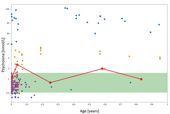 - Escolar, M.L.; Kiely, B.T.; Shawgo, E.; Hong, X.; Gelb, M.H.; Orsini, J.J.; Matern, D.; Poe, M.D. Psychosine, a Marker of Krabbe Phenotype and Treatment Effect. Mol. Genet. Metab. 2017, 121, 271–278. [Google Scholar] [CrossRef] [PubMed]