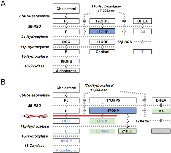 Congenital adrenal hyperplasia (CAH) is an inherited disorder caused by the loss or severely impaired activity of steroidogenic enzymes involved in cortisol biosynthesis (Figure 1A,B) [1,2]. More than 90 percent of cases result from 21-hydroxylase deficiency (21OHD) caused by mutations in CYP21A2. The prevalence of 21OHD is estimated to be 1:15,000–16,000 in the USA and Europe [3] and slightly lower in Japan (1:18,000) [4,5,6]. The clinical spectrum of the disease ranges from the most severe to mild forms, depending upon the degree of enzyme deficiency [2].