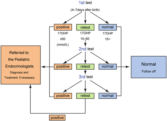 The NBS has two different cutoff values: for “screening positive” and for “retest”. When the 17αOHP level is higher than the screening positive cutoff value, the neonate is directly referred to a pediatric endocrinologist for further endocrinological evaluation. Neonates with 17αOHP levels more than the retest cutoff value are retested. When the 17αOHP levels are higher than the retest cutoff value two–three times, the screening is considered positive (Figure 2) [4,5,11,12,13].