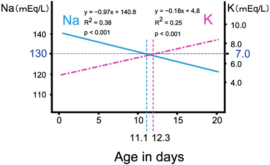 Clinical features of serum sodium (Na) and potassium (K) levels in 21OHD neonates. Retrospective analysis of the NBS in Tokyo revealed that, in classical 21OHD patients, the serum Na and K levels linearly deteriorated with age in days, and the age when the regression lines reached Na < 130 mEq/L, K > 7 mEq/L approximately coincided at 11.1 and 12.3 days, respectively. (Modified from Gau et al., 2020 [13]).