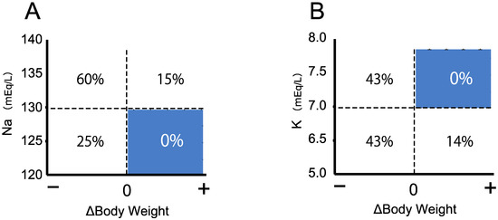 The follow-up survey in Tokyo revealed that from the second week of life, changes in body weight provide a useful index in the evaluation of neonates with positive CAH screening results [13]. Neonates with decreasing body weight from the birth weight are likely to have classical 21OHD, and neonates with increasing body weight after birth are more likely to be false positives [13]. Furthermore, even in cases of 21OHD, the possibility of developing severe salt wasting, such as hyponatremia (<130 mEq/L) or hyperkalemia (>7 mEq/L), is extremely low without loss of body weight (Figure 4). Contrary to body weight change, the relevance of predicting severe salt wasting based on the 17αOHP level is extremely low because the 17αOHP level is not associated with Na or K levels [13].