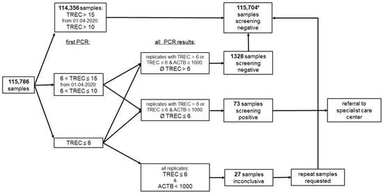 Screening algorithm. Analyte concentrations are reported in copies/well, and the referral cut-off was TREC ≤ 6 copies/well; * 2 parents refused newborn screening but sent screening cards to the laboratory, 7 children with inconclusive samples were lost to follow-up, and 20 had normal values upon testing of a new screening card.