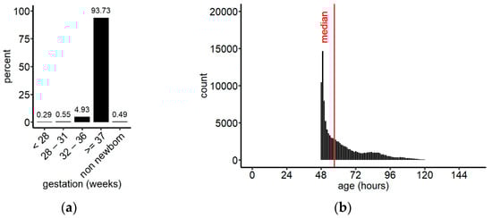During the reporting time, samples from 115,786 children up to 2 years of age arrived at the laboratory of which 55,787 (48.18%) were female, 59,985 (51.81%) were male, and for 14 the sex was not noted in the database. The dataset contained 115,216 newborns and 570 children between 28 days and 2 years of age (non-newborns). Among the newborns, 108,524 were term babies (born ≥ week 37), 5704 were moderate preterm (week 32–36), 642 very preterm (week 28–31), 341 extremely preterm (<week 28), and for 5 infants gestational age was unknown (Figure 2a). The median age at sampling was 58.1 h (IQR 49.9, 73.9) for term babies, and 57.1 h (IQR 49.9, 73.0) for the entire population of newborns included in this study (Figure 2b). Approximately 65% of all newborn samples were collected between 48 h and 72 h of age, which is in accordance with the sampling instructions.