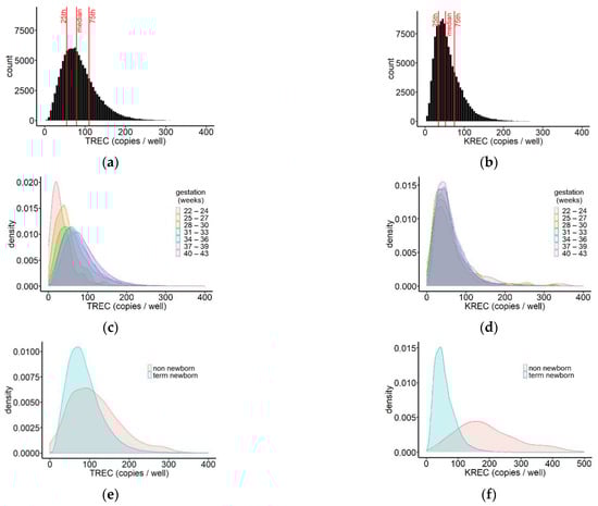 Distribution of TREC (a) and KREC (b) values in the screened population. Median (IQR)TREC = 79 (55, 110); overall, 55 samples had TREC values above 400 copies/well (data not shown); median (IQR) KREC = 51 (34, 75), and 42 samples had KREC values above 400 copies/well (data not shown); n = 115,757. Distribution of TREC (c) and KREC (d) values in newborns for different gestational ages represented by density plots. n = 115,189; samples above 400 copies/well are not shown; (e) density plot of the distribution of TREC values in screened non-newborns (n = 563), compared to term newborns (n = 108,508), showing a comparatively larger percentage of non-newborn children with very low or very high TREC concentrations. The median TREC concentration was 103 copies/well (IQR 64, 150) in non-newborns and 80 copies/well (IQR 56, 111) in term newborns; (f) density plot of the distribution of KREC values in screened non-newborns and term newborns showing a right shift of the KREC results for non-newborns in comparison to term newborns. The median KREC concentration was 180 copies/well (IQR 135, 258) in non-newborns and 51 copies/well (IQR 34, 74) in term newborns.
