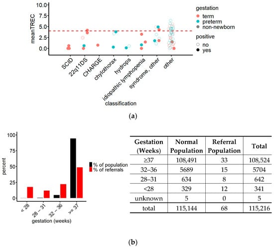 (a) TREC values of referrals grouped by clinical diagnosis and gestational age demonstrating the accumulation of the TREC values of TP (SCID and non-SCID lymphopenia, filled circles) in the lower half of the referral interval while the TREC values of FP (non-lymphopenic children, empty circles) were spread throughout the entire referral interval. Red dashed line = hypothetical referral cut-off at TREC 4 copies/well. N = 73; (b) comparison of the contribution of gestational age groups to the screened newborn population and to the referrals (left) and crosstabulation of the data underlying the statistical analysis (right) revealing an overrepresentation of preterm children in the referred population (red) compared to their frequency in the screened population (black); chi-squared test, x2 = 900.75, df = 4, p < 0.0001.