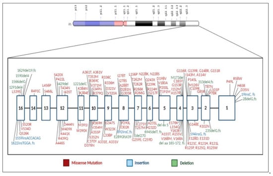The gene for cystathionine β-synthase (CBS) and mutations associated with HCU. The gene has been mapped to chromosome 21q22.3. (Al-Sadeq, D.W.; Nasrallah, G.K., Genes, 2020, 11, 330; doi:10.3390/genes 11030330).