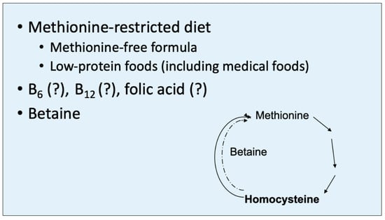 Following the identification of HCU, a low-methionine diet is begun (Figure 4). The diet is markedly reduced in natural protein, so much so that protein restriction alone would quickly produce profound nutritional deficiencies. Consequently, a special medical food (often referred to as “formula”) is required. This “formula” is a methionine-free elemental mixture of essential and non-essential amino acids, carbohydrates, fat, essential fatty acids, minerals and vitamins to provide the additional required nutrition to support normal growth and development. For children beyond infancy and older individuals with HCU, a supplement known as betaine is also usually given. Betaine (trimethylglycine) is the substrate for betaine-homocysteine methyltransferase and stimulates the remethylation of methionine (i.e., it contributes one of its three methyl groups to homocysteine to form methionine, thus methylating homocysteine) (Figure 4). The goal of this diet and the betaine supplement is to reduce the markedly elevated concentration of homocysteine, presumably the toxic metabolite in HCU, and prevent clinical consequences.