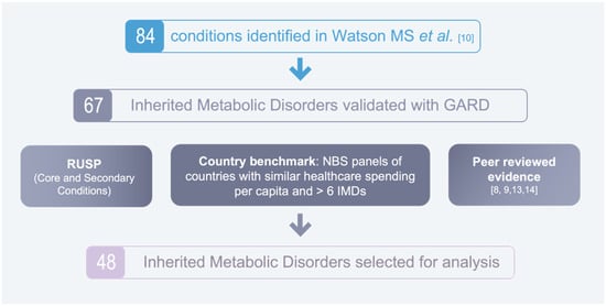 A three-step process was used to select which IMDs would be analysed with the NBS evaluation algorithm (see Figure 1). First, we identified the 84 disorders that were initially considered by the US working group to develop the RUSP in Watson MS et al. [10]. Next, we used the Genetic and Rare Diseases (GARD) Database to validate sixty-seven IMDs. Lastly, 48 IMDs were selected for analysis, based on the following three criteria to advantage disorders that are already widely screened for or that have previously been recommended for screening: (1) The disorder is included in the US RUSP Core Conditions or Secondary Conditions list. (2) The disorder is screened for in the following eight countries, that have a similar healthcare expenditure per capita and who screen for over six IMDs: Germany, Sweden, Austria, Australia, Iceland, New Zealand, Italy, and Portugal [11]. (3) The disorder was recommended for screening in one of three peer-reviewed publications [7,12,13] or by the EU Network of Experts on NBS [6].