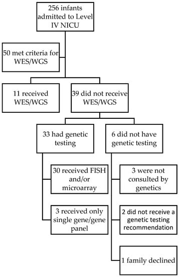 To further explore the potential relevance of these considerations, we reviewed 256 infants <120 days old admitted to a single Level IV NICU during a time in which the hospital required insurance approval prior to completing inpatient genetic testing. IRB approval was obtained for this review. During a 6-month period in 2017, 50 infants were eligible for genomic sequencing based on specific criteria []. These criteria were similar to those commonly used in a NICU setting for determining clinical trial inclusion for rapid WES and/or WGS [,,,,,]. At that time, few insurance companies were approving clinical WES for inpatients and no insurance company was approving clinical WGS []. Most infants (45/50) received genetics consults in the NICU. However, only 22% (11/50) received WES/WGS. Of the 39 neonates who did not, 30 received FISH and/or chromosomal microarray (CMA) with or without single gene or gene panel testing, 3 received only a single gene or gene panel testing, and 6 did not receive any genetic. Among those who did not get tested, one family declined testing, and two cases who were consulted by genetics did not receive any testing recommendation (Figure 1). Is it possible that the need for insurance pre-approval played a role in explaining why there were relatively few patients who received WES/WGS? Regardless of the answer, should genetic testing for acutely ill infants be limited by insurance pre-approval? Does this approach ensure equitable access to a rapid genetic diagnosis?