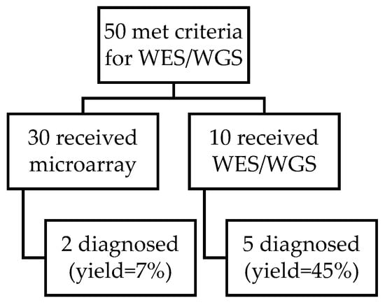Of the infants who received WES/WGS, five were diagnosed, resulting in a 45% diagnostic yield. FISH and/or CMA were used in 60% (30/50) of neonates and diagnosed 2, resulting in a 7% (2/30) diagnostic yield (Figure 2). Thus, although the utilization of WES/WGS was low, it accounted for most of the genetic diagnoses.