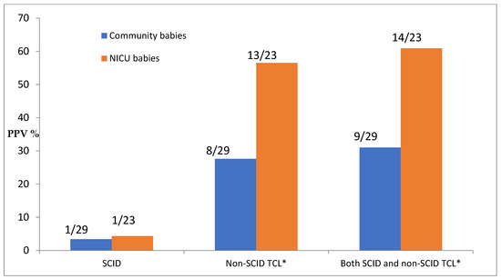 Positive predictive value (PPV) of screening by diagnosis and population. * TCL = T-cell lymphopenia; count here includes TCL due to preterm alone.