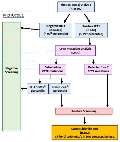 - Sadik, I.; Pérez de Algaba, I.; Jiménez, R.; Benito, C.; Blasco-Alonso, J.; Caro, P.; Navas-López, V.M.; Pérez-Frías, J.; Pérez, E.; Serrano, J.; et al. Initial Evaluation of Prospective and Parallel Assessments of Cystic Fibrosis Newborn Screening Protocols in Eastern Andalusia: IRT/IRT versus IRT/PAP/IRT. Int. J. Neonatal Screen. 2019, 5, 32. [Google Scholar] [CrossRef] [Green Version]