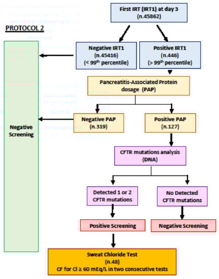 - Sarles, J.; Giorgi, R.; Berthézène, P.; Munck, A.; Cheillan, D.; Dagorn, J.C.; Roussey, M. Neonatal screening for cystic fibrosis: Comparing the performances of IRT/DNA and IRT/PAP. J. Cyst. Fibros. 2014, 13, 384–390. [Google Scholar] [CrossRef] [Green Version]