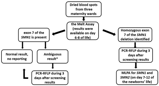 The algorithm for screening and follow-up is shown in Figure 1. The pilot project was carried out via the melt assay using the SALSA® MC002 SMA Newborn Screen Kit (MRC Holland) according to the manufacturer’s protocol. The assay can be performed on a crude DNA extract prepared from a 1.5 mm or 3.2 mm punch of a DBS card. After screening directly from DBS cards, DNA extraction from positive and ambiguous DBS samples was carried out for PCR-RFLP to confirm the presence of the homozygous deletion of exons 7 and 8 of the SMN1 gene and to make a diagnosis of 5q SMA; the analysis took up to 3 days, according to the laboratory’s timing. The positive samples were validated using the restriction fragment length polymorphism (RFLP) (exon 7—5′AAAGCTATCTATATATAGCTATCG*AT, 3′TCACTTTCATAATGCTGGCAGAC; exon 8—5′GTAATAACCAAATGCAATGTGAA, 3′CTACAACACCCTTCTCACAGG; * nucleotide, implemented into the primary sequence to create a restriction site for BseJ1 endonuclease (Thermo Scientific, Vilnius, Lithuania). Details on the performance of the PCR-RFLP analysis during the pilot project are provided in Appendix A. Immediately after receiving the screening result, the parents were contacted to summon them to the Research Center for Medical Genetics for blood sampling of the whole family (referring to parents and siblings). Confirmatory molecular tests were performed on a fresh blood sample with signed informed consent; this strategy was chosen also to rule out sampling mismatch at the maternity ward since we did not expect false positive results. DNA extraction from peripheral blood leukocytes of positive samples was performed for direct automated Sanger sequencing and MLPA. DNA extraction from peripheral blood leukocytes and DBS to conduct the following tests was performed using the Wizard® Genomic DNA Purification Kit (Promega, Madison, WI, USA) according to the manufacturer’s protocol. MLPA was a reference method to confirm the presence of homozygous deletion of exons 7 and 8 of the SMN1 gene as well as establish the SMN2 copy number for subsequent gene therapy for the newborn and establish 5q SMA carrier status in the parents. Parents of newborns with a homozygous deletion of exon 7 of the SMN1 gene were examined to determine the number of copies of SMN1 and SMN2 with quantitative MLPA using the SALSA MLPA Probemix P060 SMA Carrier Kit (MRC Holland, Amsterdam, the Netherlands) according to the manufacturer’s protocol. The result of the SMN2 gene copy number was given on days 7–12 of the newborns’ lives. The coding sequences and adjacent intronic regions of exons 7 and 8 of the SMN1 gene (NM_00344.3) (exon 7—5′GTGAAACAAAATGCTTTTTAACATCC, 3′CCATAAAGTTTTACAAAAGTAAGATTCAC, exon 8—5′GGTTTAACTGGAATTCGTCAAGC, 3′CAAATTTTCTCAACTGCCTCACC) were analyzed via direct automated Sanger sequencing for the identification of exon 7 of SMN2 splicing-modifier variants.