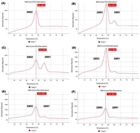 In the SALSA MC002 SMA Newborn Screen, PCR amplification of exon 7 of the SMN1 gene and the closely related SMN2 gene is performed, followed by fluorescent probe binding to the amplicons and generation of a melt curve. Fluorescence is only measured during melt curve generation. Examples of the screening assay results from controls and ambiguous cases are shown in Figure 2. Red indicates the sample that we analyzed. In the sample in which the signal from exon 7 of the SMN2 gene was registered, the signal from exon 7 of the SMN1 gene was not registered—the control of deletion of exon 7 of the SMN1 gene (from SALSA® MC002) (Figure 2A). The sample in which the signal from exon 7 of the SMN1 gene and the signal from exon 7 of the SMN2 gene were registered in the intensity ratio 1:5 (the normal control from SALSA® MC002) (Figure 2B). The sample that showed a signal from exon 7 of SMN1 and SMN2, a control of normal genotype that was then validated by MLPA (Figure 2C). Samples that showed an intensity ratio of approximately 1:9 higher than the control in the SALSA® MC002 (Figure 2D–F). However, a signal from exon 7 of SMN1 and SMN2 is detected. These samples were validated by PCR-RFLP. These samples were also analyzed with quantitative MLPA. According to the MLPA results for these samples, the following genotypes are shown: one copy of SMN1 and three copies of SMN2 per genome (Figure 2D); one copy of SMN1 and four copies of SMN2 per genome (Figure 2E); and one copy of SMN1 and three copies of SMN2 per genome (Figure 2F).