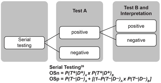 Calculation of OSn and OSp validity measures using serial testing of hypothetical test A and test B. D, disease; OSn, overall sensitivity; OSp, overall specificity; P, probability; Sn, sensitivity; Sp, specificity; T, test.