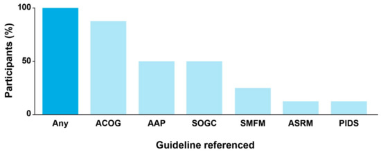 Figure 1). Preferences for CPGs issued by specific societies differed according to clinical subspecialty. Participants suggested that OB/GYNs generally favor ACOG as a source of clinical guidance, whereas MFM and reproductive specialists also consult SMFM or the American Society for Reproductive Medicine (ASRM) CPGs. The AAP was identified as the major professional society guiding care for children with cCMV infection.
