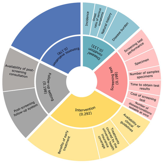 The calculated weights were 0.292 for the ‘intervention’, 0.198 for the ‘screening test’, 0.198 for the ‘follow-up setting’, 0.178 for the ‘economic evaluation’, and 0.133 for the ‘disease/condition ‘(Figure 1). CIs were below 0.15 for all items. The final allocation of scores is shown in Table 3. The highest possible score was 620 points, and the lowest possible score was 114 points. The results of the evaluation of the current NBS target diseases, phenylketonuria, MCAD deficiency, and CH were 609, 605, and 540 points, respectively (Table 4, Table 5 and Table 6).