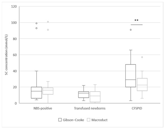Differences in SC levels were not statistically significant between the two methods, with a median of 16 mmol/L [IQR: 9.3–29.8] and 16 mmol/L [IQR: 11.0–23.0] for the Gibson–Cooke and Macroduct system-based method, respectively (p = 0.13). However, there was a significant difference between the mean values of SC measured by the Gibson–Cooke and Macroduct system-based method in the children with CFSPID [29.0, IQR: 20.0–48.0 and 22.5, IQR: 15.5–30.8 respectively] (p = 0.01; Figure 1).