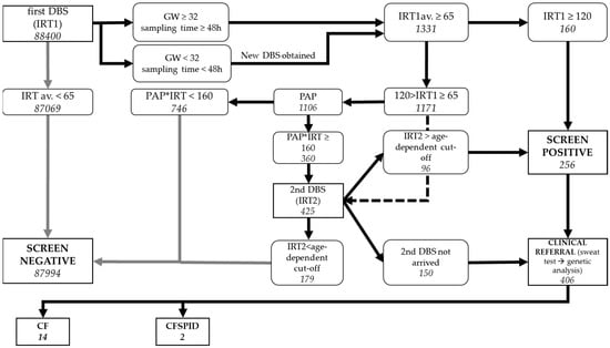 - Sommerburg, O.; Stahl, M.; Hammerling, S.; Gramer, G.; Muckenthaler, M.U.; Okun, J.; Kohlmuller, D.; Happich, M.; Kulozik, A.E.; Mall, M.A.; et al. Final results of the southwest German pilot study on cystic fibrosis newborn screening—Evaluation of an IRT/PAP protocol with IRT-dependent safety net. J. Cyst. Fibros. 2022, 21, 422–433. [Google Scholar] [CrossRef]