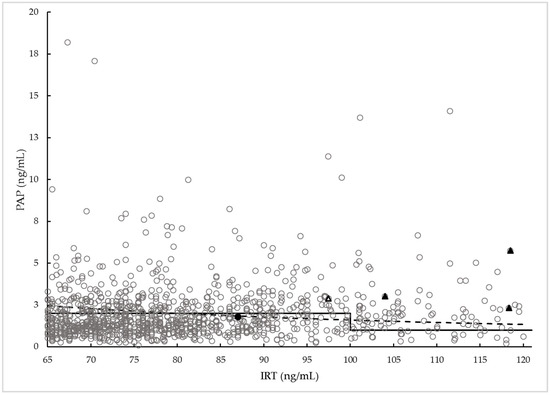 - Rock, M.J.; Mischler, E.H.; Farrell, P.M.; Wei, L.J.; Bruns, W.T.; Hassemer, D.J.; Laessig, R.H. Newborn Screening for Cystic-Fibrosis Is Complicated by Age-Related Decline in Immunoreactive Trypsinogen Levels. Pediatrics 1990, 85, 1001–1007. [Google Scholar] [CrossRef] [PubMed]