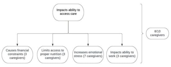 Out of the eight caregivers who indicated an impact on access to care, 62.5% (5/8) indicated multiple impacts. For the three caregivers who chose “causing financial constraints”, one also indicated that VLCADD impacted their ability to work (Figure 1).