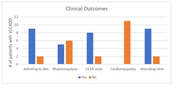 Figure 2 shows clinical outcomes of individuals with VLCADD. Adherence to the medical diet was determined through clinical notes. There were two patients (siblings) who were not adhering to the medical diet at the time of the chart review. Their caregiver strongly disagreed that VLCADD was difficult to manage, but indicated increased emotional stress from the condition for both children. For the nine patients who were adhering to the diet at the time of the chart review, 66.6% (6/9) of these caregivers reported increased emotional stress.