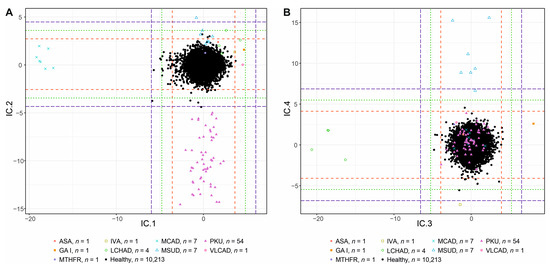 Increasing the cutoff value to obtain a better FPR increases the potential risk of false negative results in the data. In the course of a prospective study, it will therefore be necessary to establish “decision cutoff values for individual components” for the projected diseases. The interplay between sensitivity and selectivity and the importance of their proper adjustment is clearly visible in VLCAD and MSUD patients. By raising the threshold to 4sd, one VLCAD patient is not clearly separated (IC1, Figure 1A). Similarly, when shifting to 5sd, one MSUD patient is not correctly identified (IC4, Figure 1B). The special case is the patient with MTHFR, who is not clearly separated in any component constructed by other diseases and does not form a separate component in the discovery phase. As a diagnostic metabolic change, patients exhibit increased levels of homocysteine (hCys) and mildly elevated Met, and Met/Phe ratio. In routine screening, these patients are selected for Met, and Met/Phe ratio with relatively low cutoff. Approximately 1–2% of the patients admitted for the screening are selected for following second-tier testing based on the measurement of hCys level as a specific biomarker compared to methionine. It is expected that the patient with MTHFR could not be detected since hCys is lacking within the screening, and there was only a mild elevation in nonspecific methionine.