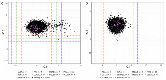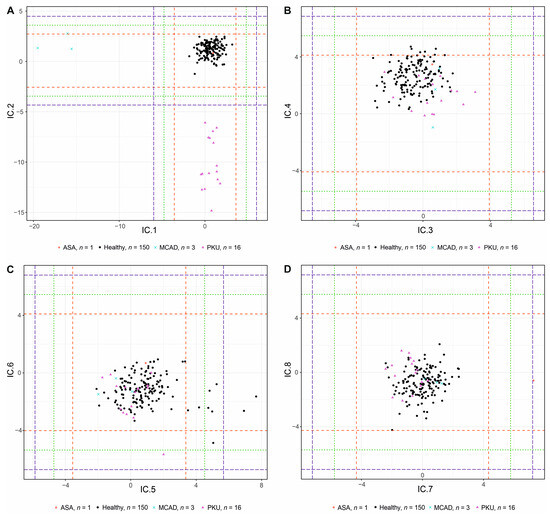 A full 5sd separation of these diseases was observed in the respective ICs only (i.e., IC1, IC2, and IC7; Figure 3 and Figure S4). The pattern of the AMSS values (Table S3) of the most discriminating metabolites for given groups of patients and controls always shows a high degree of similarity with Table S1. In IC1, MCAD patients were separated from disease-free controls mainly due to decreased a I C 1 M C A D C 6 and a I C 1 M C A D C 8 . Low values of a I C 2 P K U P h e resulted in a nice separation of PKU patients and control samples in IC2. Increased a I C 7 A S A C i t and a I C 7 A S A A r g S u c c values for the ASA patient compared to a I C 7 c o n t r o l C i t and a I C 7 c o n t r o l A r g S u c c indicate his separation in IC7.