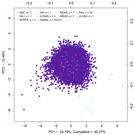 Principal component analysis (PCA), as a gold standard of the dimension reduction methods, was applied on the data (projection using the first two components is given in Figure 2). In order to respect the relative nature of the data, the compositional version of PCA, based on the clr representation, was used [25]. The variance explained by the first components is quite high given the sample size (cumulatively around 40% for the first two PCs; Figure S2; on the other hand, the ability to identify individual groups of patients is rather poor. If the “usual metabolomic approach” was applied, where only the first two or three PCs are usually plotted, a mere two of the nine IEMs present in our data would be identified as separate clusters. Therefore, all pairwise combinations of the total 25 principal components are depicted in a scatter plot (Figure S3).