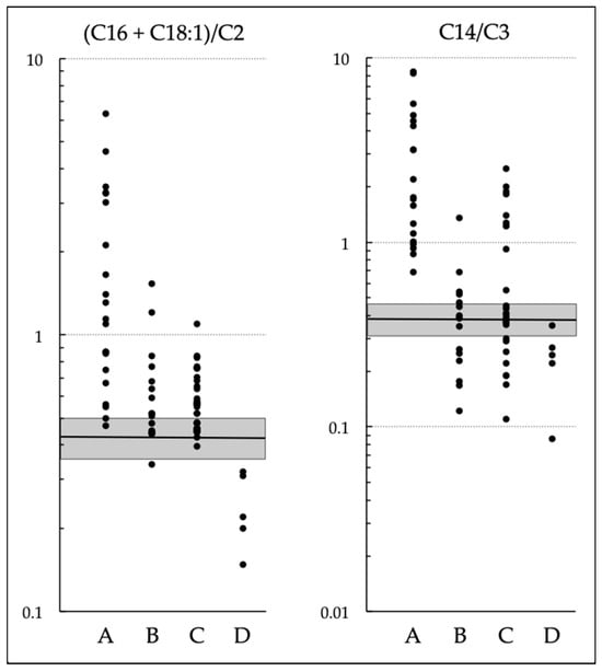 Levels of (C16 + C18:1)/C2 and C14/C3 in groups A, B, and C are illustrated in Figure 1. Because the study included data from newborns who were screened before C14/C3 was adopted, several values of C14/C3 in groups B and C are below the cutoff. An additional group, D, is described in the next section.