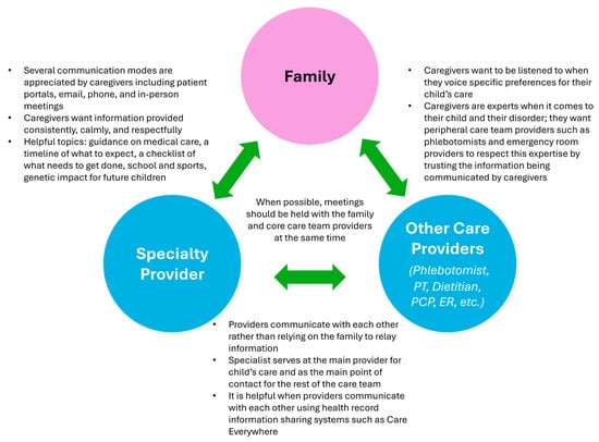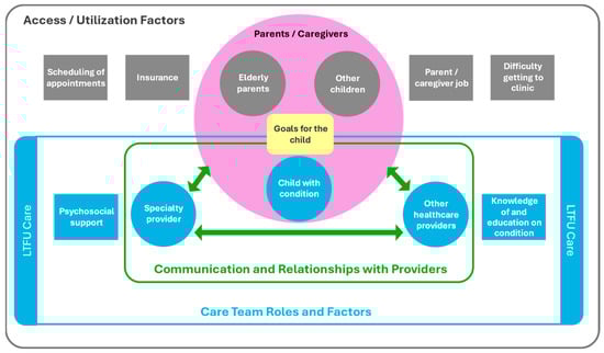 The most prominent theme in this study was the importance of the relationships and need for an effective triad of communication between the family, the specialist, and the rest of the child’s care team. These relationships and the accompanying communication triad are an essential component of equitable and sustainable LTFU. There is a strong association between best practices in physician–family communication and positive patient outcomes []. Providers applying best practices in patient-centered communication as part of LTFU build positive family-provider relationships, boost trust between families and providers, and increase caregiver’s knowledge of their child’s disorder and their capacity to advocate and care for their child [].