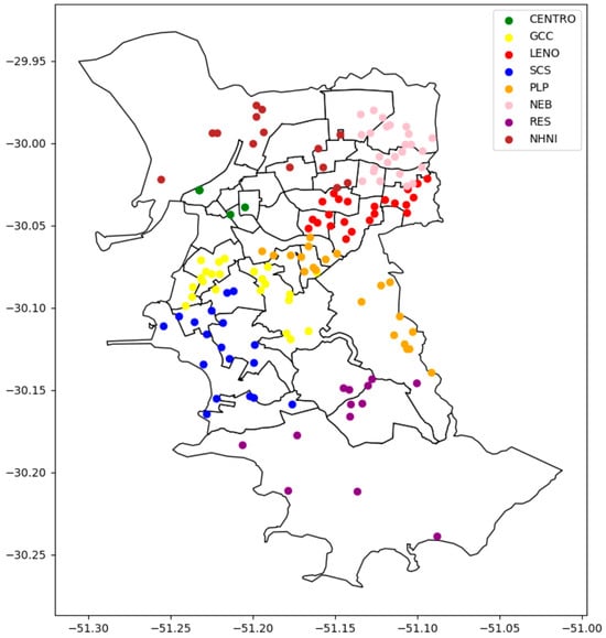 Porto Alegre has an area of 495 km2 and a population of about 1,332,845 inhabitants []. It has 137 BHUs distributed throughout the city, and they are managed by the eight District Administrations (DAs): (1) CENTRO (Center, n = 5); (2) RES (Restinga/Extreme South, n = 15); (3) GCC (Glória/Cruzeiro/Cristal, n = 20); (4) PLP (Partenon/Lomba do Pinheiro, n = 14); (5) NHNI (Northwest/Humaitá-Navegantes/Ilhas, n = 13); (6) SCS (South/Central South, n = 18); (7) LENO (East/Northeast regions, n = 21); and (8) NEB (North/Eixo-Baltazar, n = 25). DAs are regional administrative structures that implement healthcare strategies at the local level through SUS. Figure 1 shows an updated plot map with the spatial distributions of BHUs by city neighborhoods, illustrating how BHUs are organized across the eight administrative regions.