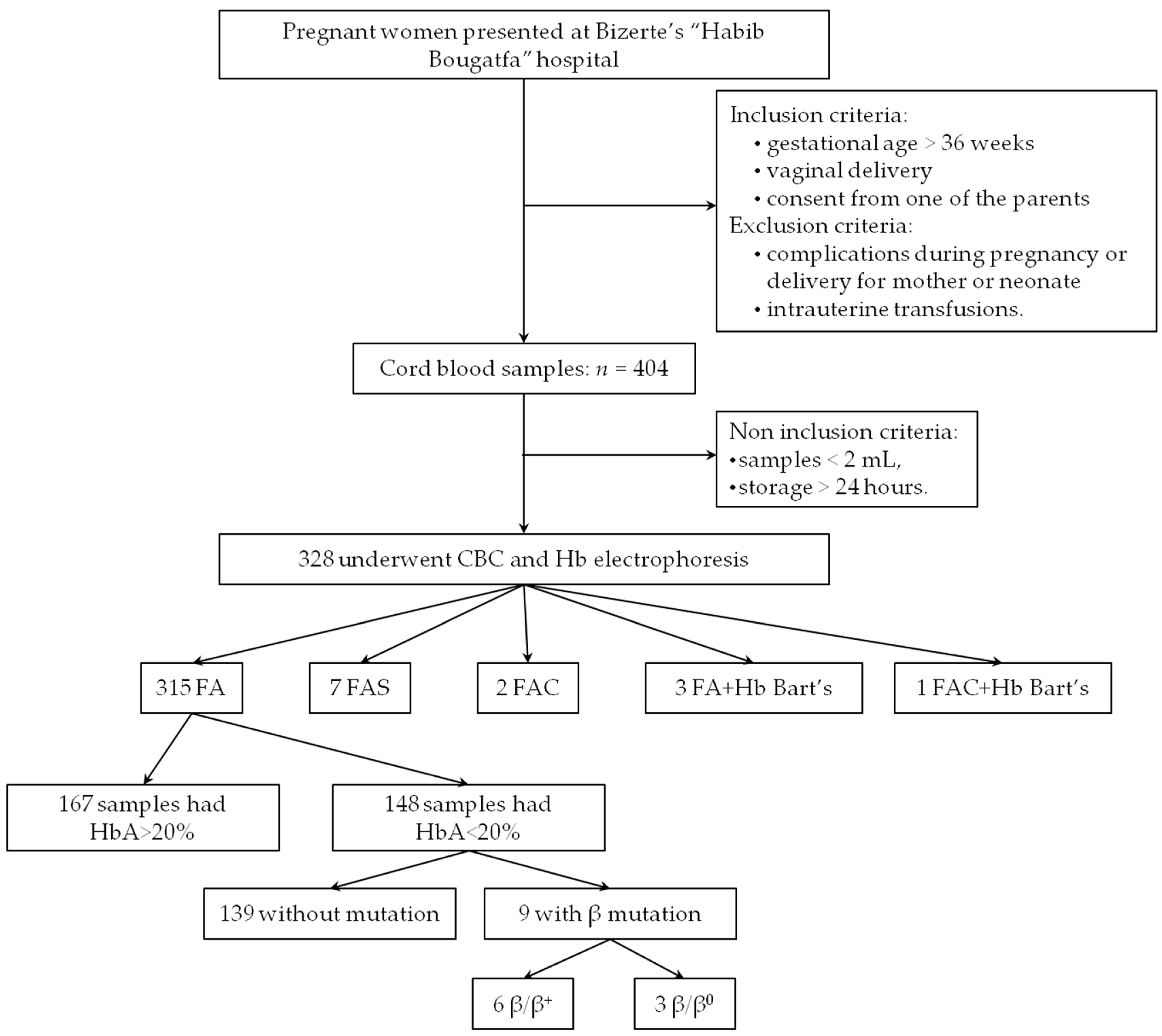 - Ouali, F.; Siala, H.; Bibi, A.; Hadj Fredj, S.; Dakhlaoui, B.; Othmani, R.; Ouenniche, F.; Zouari, F.; Bouguerra, B.; Rezigua, H.; et al. Prenatal diagnosis of hemoglobinopathies in Tunisia: An 18 years of experience. Int. J. Lab. Hematol. 2016, 38, 223–232. [Google Scholar] [CrossRef] [PubMed]