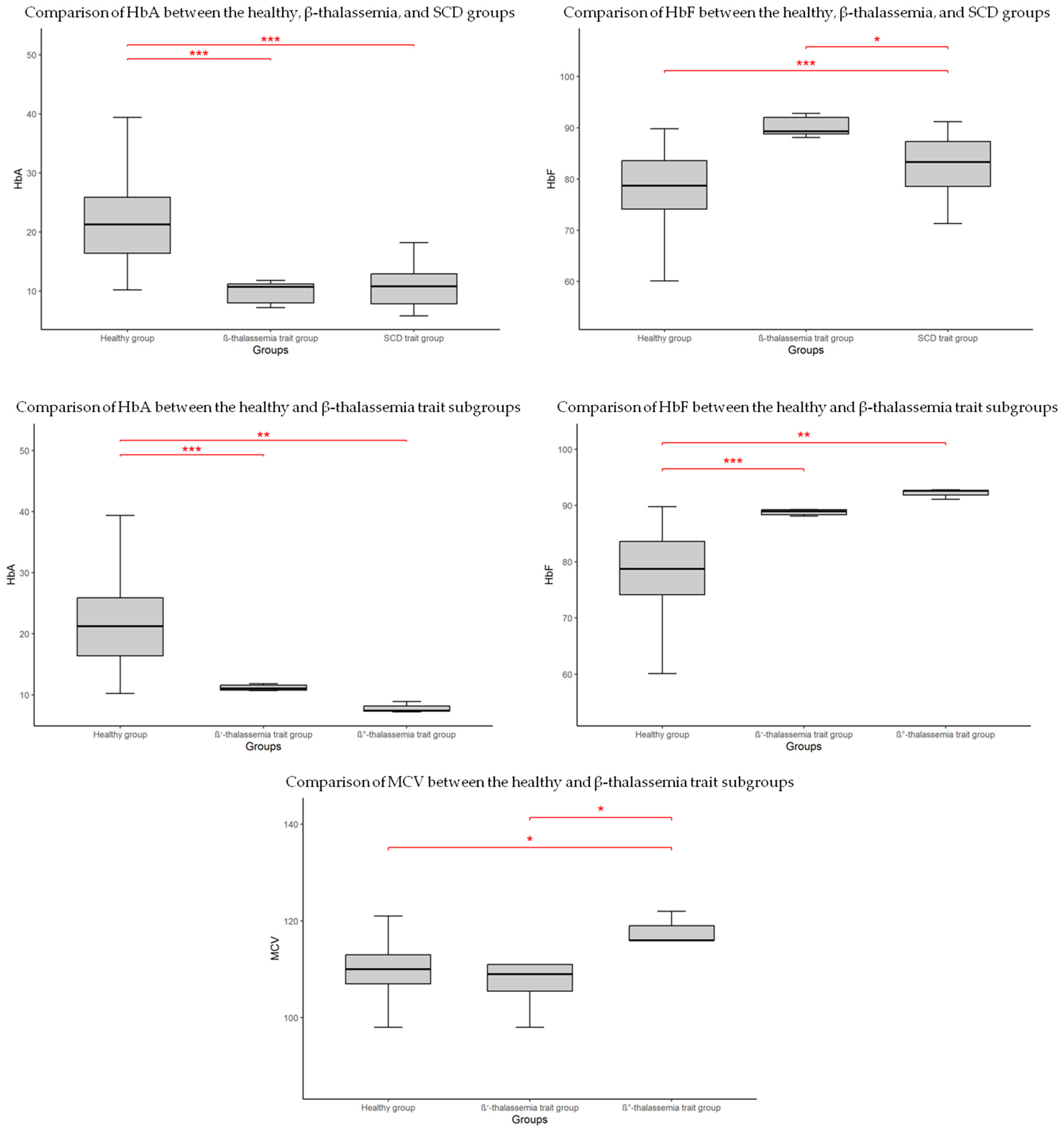 | β/β+ | β+-thalassemia trait (6) | 15.48 ± 3.01 | 4.40 ± 0.89 | 47.80 ± 9.81 | 108.83 ± 7.65 | 32.48 ± 0.68 | 12.55 ± 1.48 | 89.25 ± 1.43 | 10.72 ± 1.40 | 0 | - | - | - |