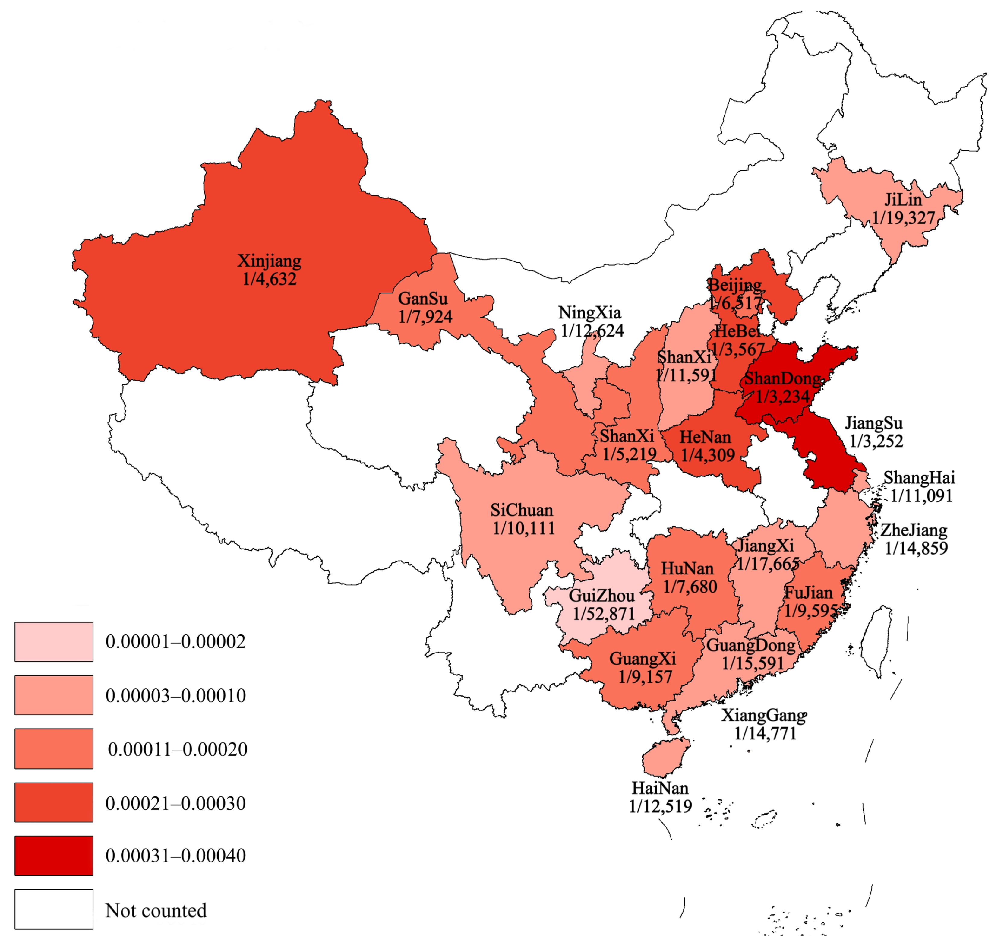 | Wang et al., 2018 [38] | Gansu | 2015–2016 | 77,957 | 4 | 1/19,489 | 3 | N/A | N/A | N/A | N/A | 1 | N/A | N/A | N/A | N/A | 7 | ||