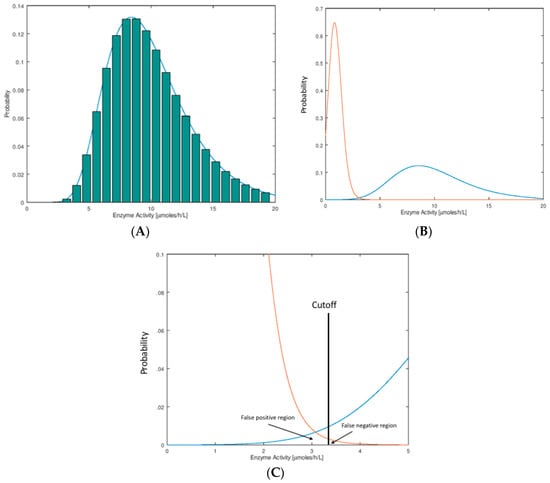 Assay of analytes in samples taken from large populations tend to display a Normal (also known as a Gaussian) distribution. For example, it would be surprising to see a flat distribution of assay values with near-vertical drop-off at the low and high ends. Enzyme activity values measured in a population have to be real positive numbers, and so the left tail of the distribution goes to the origin and stops. The right tail on the other hand has no such constraint. This leads to a skewing of the normal curve that is more obvious as the population mean assay value is less than ~5-fold larger than the distribution width. The log-normal distribution allows for this skewing, and the observed data is usually well modeled by this function (given in Supplementary Materials). There is no deep underlying reason to explain this, but rather the log-normal function provides a convenient, continuous, and well-behaved function for statistical analysis, which is consistent with the described constraints on the data. Strictly speaking, when the enzymatic activity is close to zero and with finite imprecision in the measurement, the activity measured may actually be less than that for the no-enzyme blank. In this case one obtains an enzymatic activity less than zero if the assay values are blank corrected. Thus, the PDF does not have to pass through the origin of Figure 1B, but it will pass close enough to the origin to lead to the skewing, and the log-normal function is still appropriate.