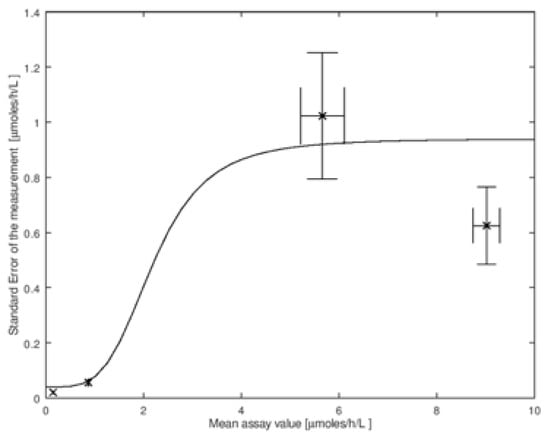 Plot of standard error (also called the standard deviation) of the measurement (σM) versus the mean activity (μM). This is for the tandem mass spectrometry assay of the GAA enzyme (relevant to Pompe disease) using the CDC Quality Control DBS. The data was obtained from the CDC (Set 2 2018 LSD FIA Certification) on their NBS web portal (https://www.cdc.gov/labstandards/nsqap_resources.html). The solid line is a model for the CDC data using the function: where a, b, and c are constants (this is a convenient function that well interpolates through the data points; it has no biological basis that we are aware of). Error bars in σM, plotted on the Y-axis, are calculated as σM/N1/2, where N is the number of punches analyzed by the CDC (N = 20). The error bars for μM, plotted on the X-axis, are calculated as /N1/2, at the 95% confidence interval, here ts is Student’s t value. These error equations are found in standard textbooks of statistics including the definition of Student’s t value, ts.