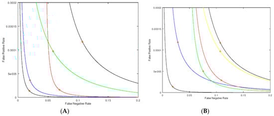 Parametric plots (modified received operating characteristic, ROC plots) where the false positive rate (fraction of healthy patients who are screen-positive) is plotted on the Y-axis, and the false negative rate (fraction of disease patients who are screen-negative) is plotted on the X-axis. The diamonds indicate the point on each curve for an assay value of 2.0 μmol/h/L (which could be chosen as the cutoff). The no-imprecision PDF is modeled by a log-normal distribution with a mean of 10.0 and a width of 3.8 μmol/h/L for the healthy population and a mean of 1.0 and width of 0.38 μmol/h/L for the patients with the disease (A). The black curve passing closest to the origin is for no-imprecision, and the other black curve is for uniform and high imprecision of σM = 0.5 μmol/h/L for all values of enzymatic activity. The blue curve is for high imprecision of σM = 0.5 μmol/h/L for enzymatic activities of 3 μmol/h/L or higher, and a negligible imprecision of σM = 0.1 μmol/h/L for enzymatic activities below 3 μmol/h/L. The red curve has the high imprecision in the window of 0 to 1 μmol/h/L and negligible imprecision elsewhere. The green curve has high imprecision in the window of 1 to 3 μmol/h/L (passing through the cutoff) and negligible imprecision elsewhere. (B). Black curves as for Panel A. The blue curve has lowered imprecision (σM = 0.25 μmol/h/L) in the window 0–2 μmol/h/L and high imprecision (σM = 0.50 μmol/h/L) elsewhere. This region of lowered imprecision is slid to the right to give the green curve (σM = 0.25 μmol/h/L in the window of 1–3 μmol/h/L), further to the right to give the red curve (σM = 0.25 μmol/h/L in the window 2–4 μmol/h/L), and even further to the right to give the yellow curve (σM = 0.25 μmol/h/L in the window 3-5 μmol/h/L).
