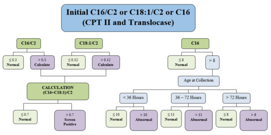 On day 8 of life, she was identified as at-risk for CPT II deficiency or carnitine-acylcarnitine translocase (CACT) deficiency via expanded newborn screening using tandem mass spectrometry. The full screening algorithm for CPT II deficiency and/or CACT deficiency can be found in Figure 1.