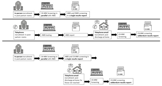 Recruitment, testing and reporting for the Duchene muscular dystrophy newborn screening. The three time periods of recruitment are depicted: pre-pandemic (top line), remote recruitment during the start of the pandemic (middle line), and hybrid recruitment (bottom line). During hybrid recruitment, phone and email recruitment were used to recruit babies who were delivered on weekends or holidays or were not available to recruit while they were in the hospital. Abbreviations: routine newborn screening (rNBS), creatine kinase-MM (CK-MM).